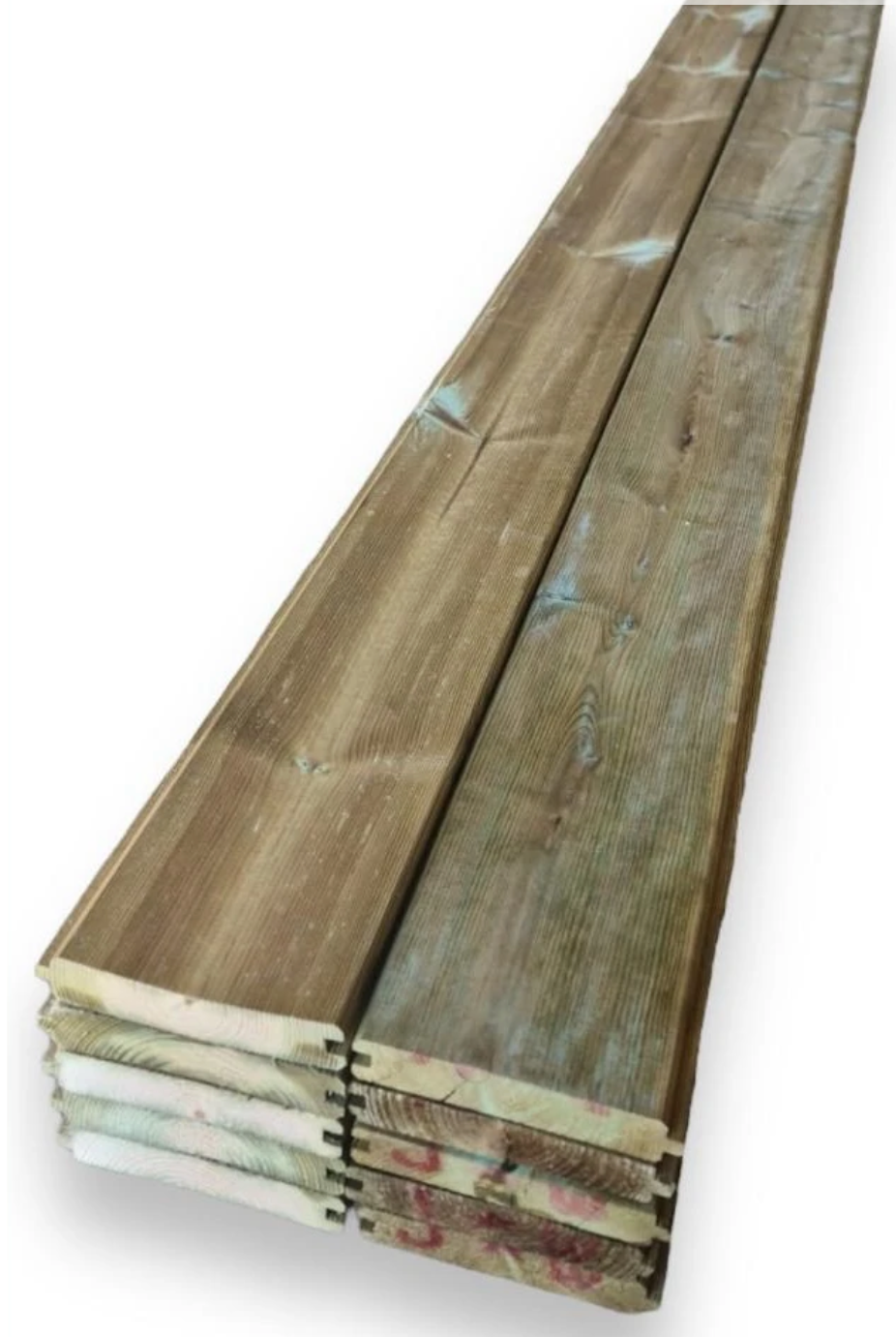 Gracias a su tratamiento en autoclave, estos machihembrados alcanzan una clase de riesgo IV, lo que garantiza su durabilidad frente a la intemperie. Este proceso también les otorga un característico tono verdoso en toda su superficie.